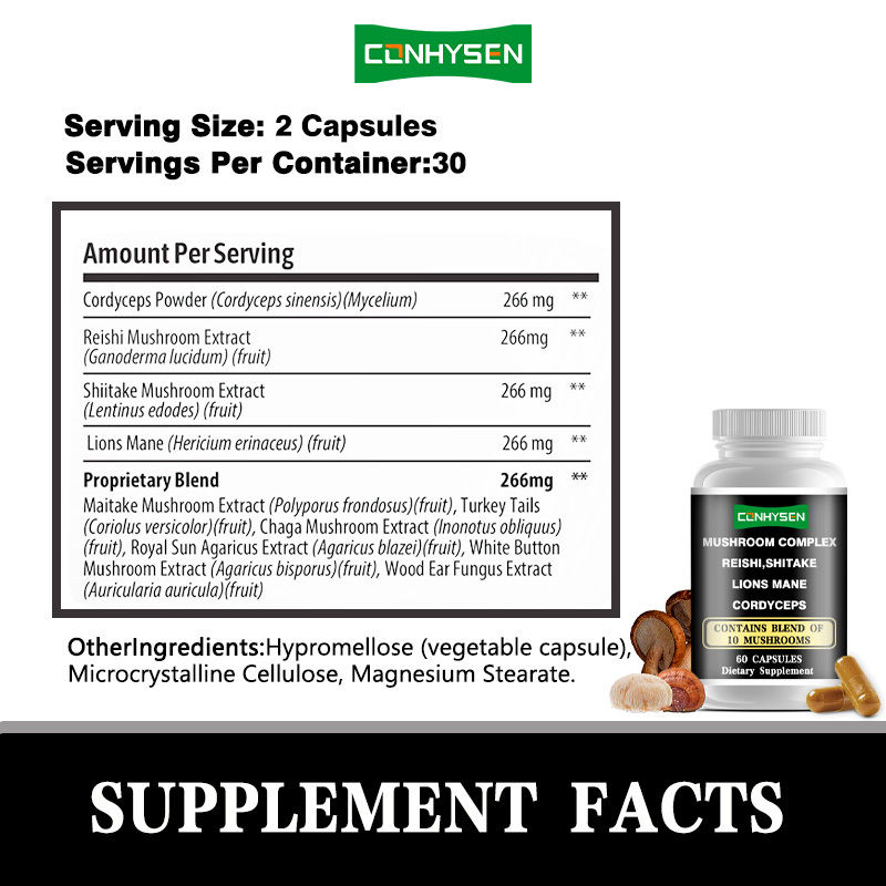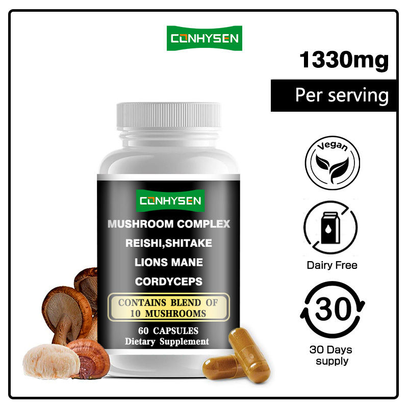کپسولهای کمپلکس قارچ لیبل خصوصی تقویتکننده ایمنی، سلامت روده، انرژی، 10 قارچ