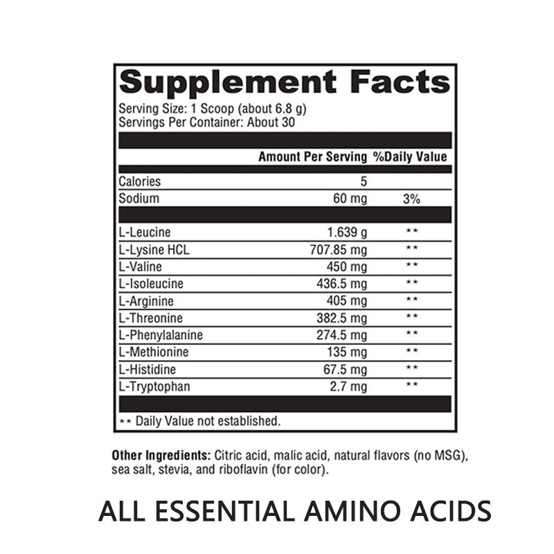 L-لوسین، L-لوسولوسین، L-والین، L-لیسین HCL، L-ارژینین، L-تریونین، L-فنیلالانین، L-متیونین، L-هیستیدین، L-تریپتوفان