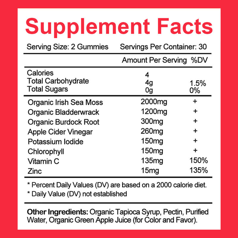 خزه ارگانیک ایرلندی ، ویتامین C ، روی ، مثانه ارگانیک ، ریشه برونک ارگانیک ، سرکه سیب ، یدید پتاسیم ، کلروفیل