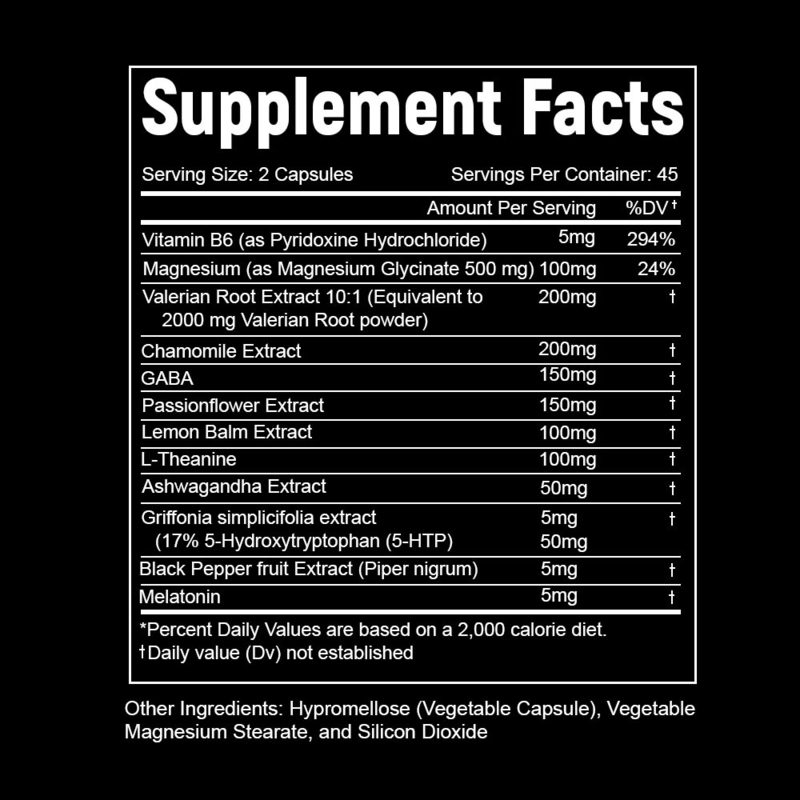 ویتامین B6، منیزیم، عصاره ریشه والرین، عصاره بابونه، GABA، عصاره گل ساعتی، عصاره بادرنجبویه، ال-تئانین، عصاره آشواگاندا، عصاره گریفونیا سیمپلیسیفولیا، عصاره میوه فلفل سیاه، ملاتونین