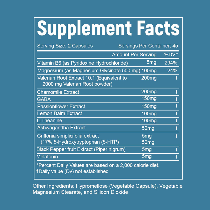 ویتامین B6، منیزیم، عصاره ریشه والرین، عصاره بابونه، GABA، عصاره گل ساعتی، عصاره بادرنجبویه، L-Theanine، عصاره آشواگاندا، عصاره Griffonia Simplicifolia، عصاره میوه فلفل سیاه، ملاتونین