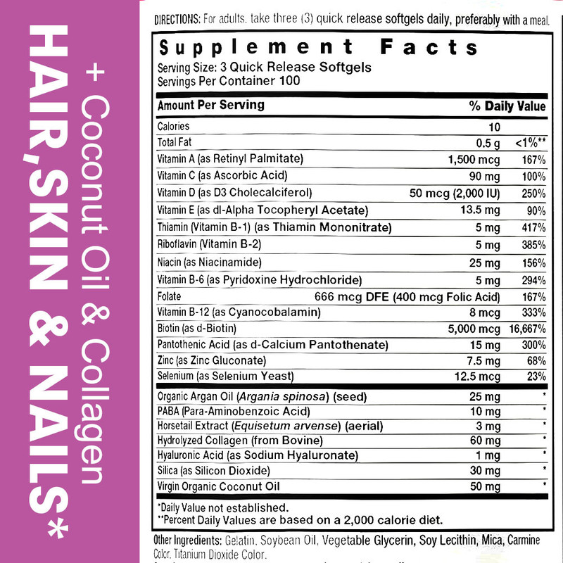Multivitamins, Organic Argan Oil, PABA, Hydrolyzed Collagen, Virgin Organic Coconut Oil, Silica, Zinc, Biotin
